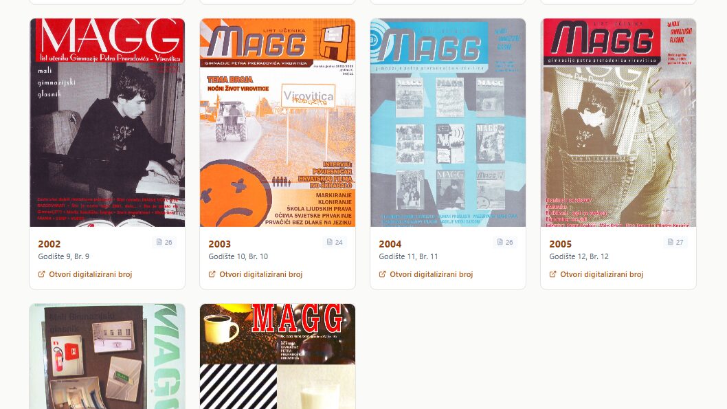 MAGG donosi literarne, novinarske, likovne i fotografske radove učenika Gimnazije Petra Preradovića Virovitica, a kroz cijelo razdoblje izlaženja časopis je uređivala profesorica Zdenka Kos. Ova baza prvi put okuplja sve radove na jednom mjestu i omogućuje jednostavan pristup školskom stvaralaštvu kroz godine.